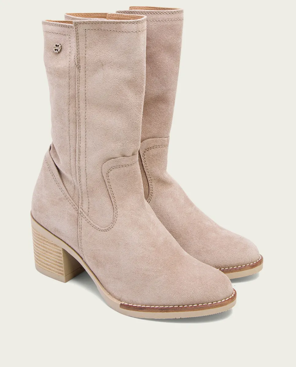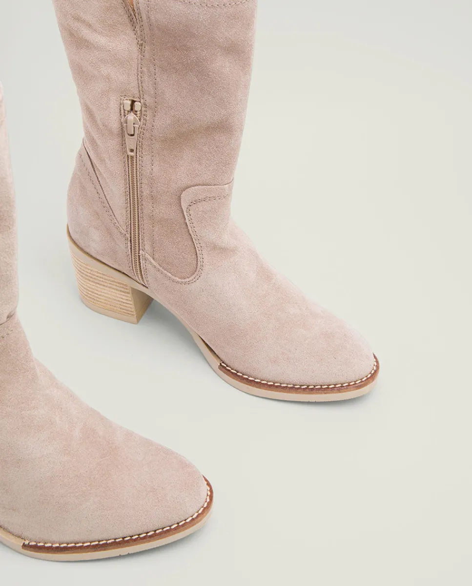 Botas De Serraje Con Tacón De 6,5 Cm Y Altura De Cana De 21 Cm. Corte Superior En V Y Cremallera Lateral Interior Para Facilitar El Calce. Plantilla Y Forro De Microfibra Con Acabado Confort Aterciopelado. Elaborado 100% En Espana.