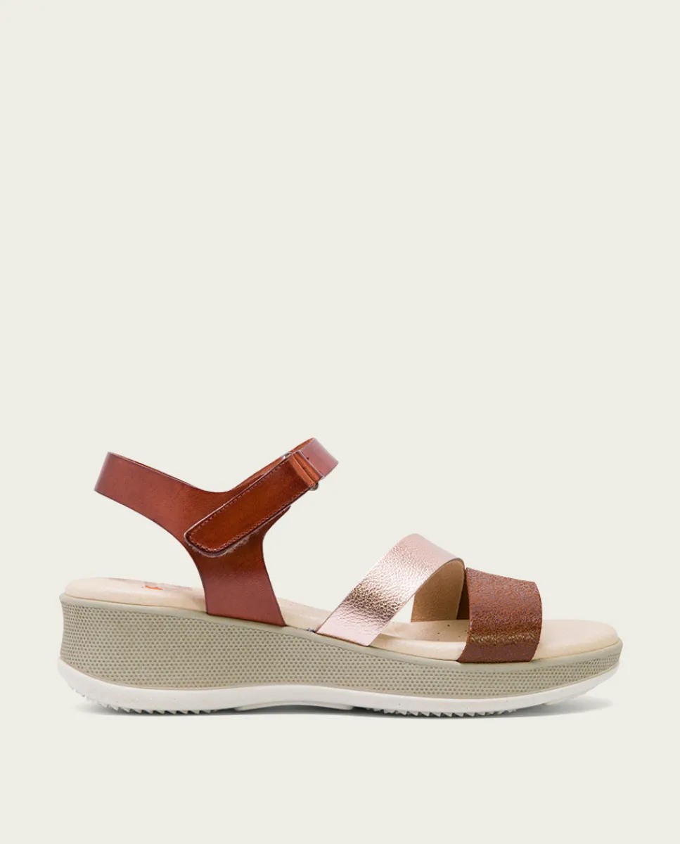 Sandalia De Piel Con Tiras Combinando Tonos Mate Y Metalizados. Cierre Mediante Velcro. Corte Y Plantilla Acolchada De Piel Que Garantiza Una Gran Comodidad. Cuña De 4,5 Cm Y Plataforma De 2 Cm. Fabricado Artesanalmente En Espana.