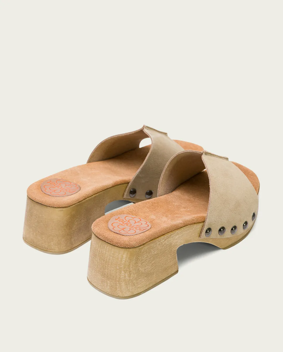 Sandalias De Tacón Bajo De Serraje Tipo Zueco Abierto. Piso De Tacón Ancho De 5 Cm Y Plataforma De 2,5 Cm Con Acabado De Madera. Plantilla Acolchada De Serraje Que Garantiza Una Gran Comodidad. Fabricado En Espana.