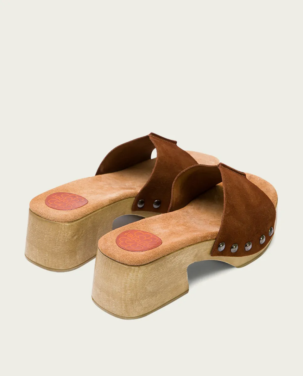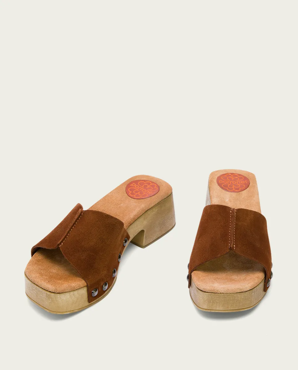 Sandalias De Tacón Bajo De Serraje Tipo Zueco Abierto. Piso De Tacón Ancho De 5 Cm Y Plataforma De 2,5 Cm Con Acabado De Madera. Plantilla Acolchada De Serraje Que Garantiza Una Gran Comodidad. Fabricado En Espana.