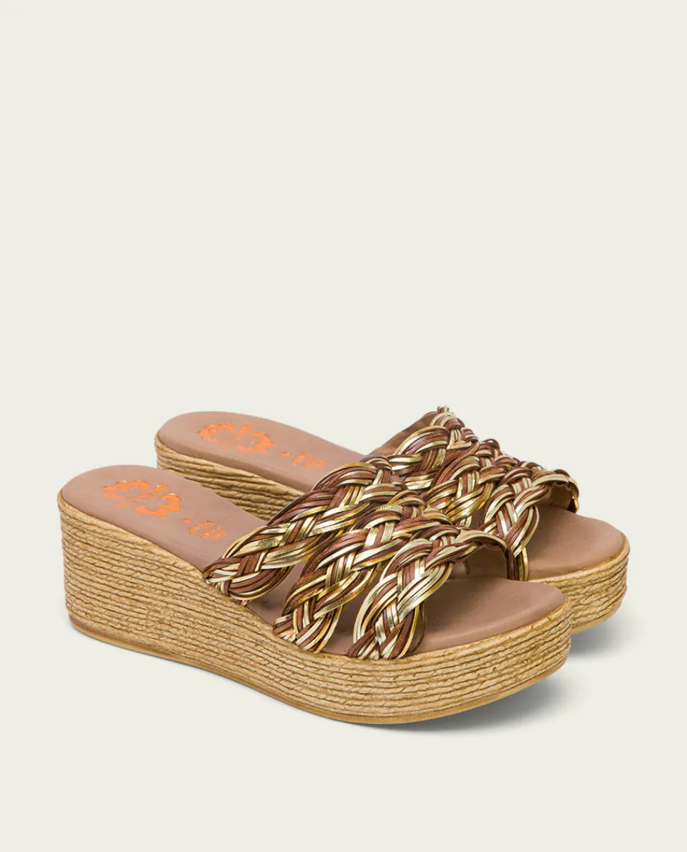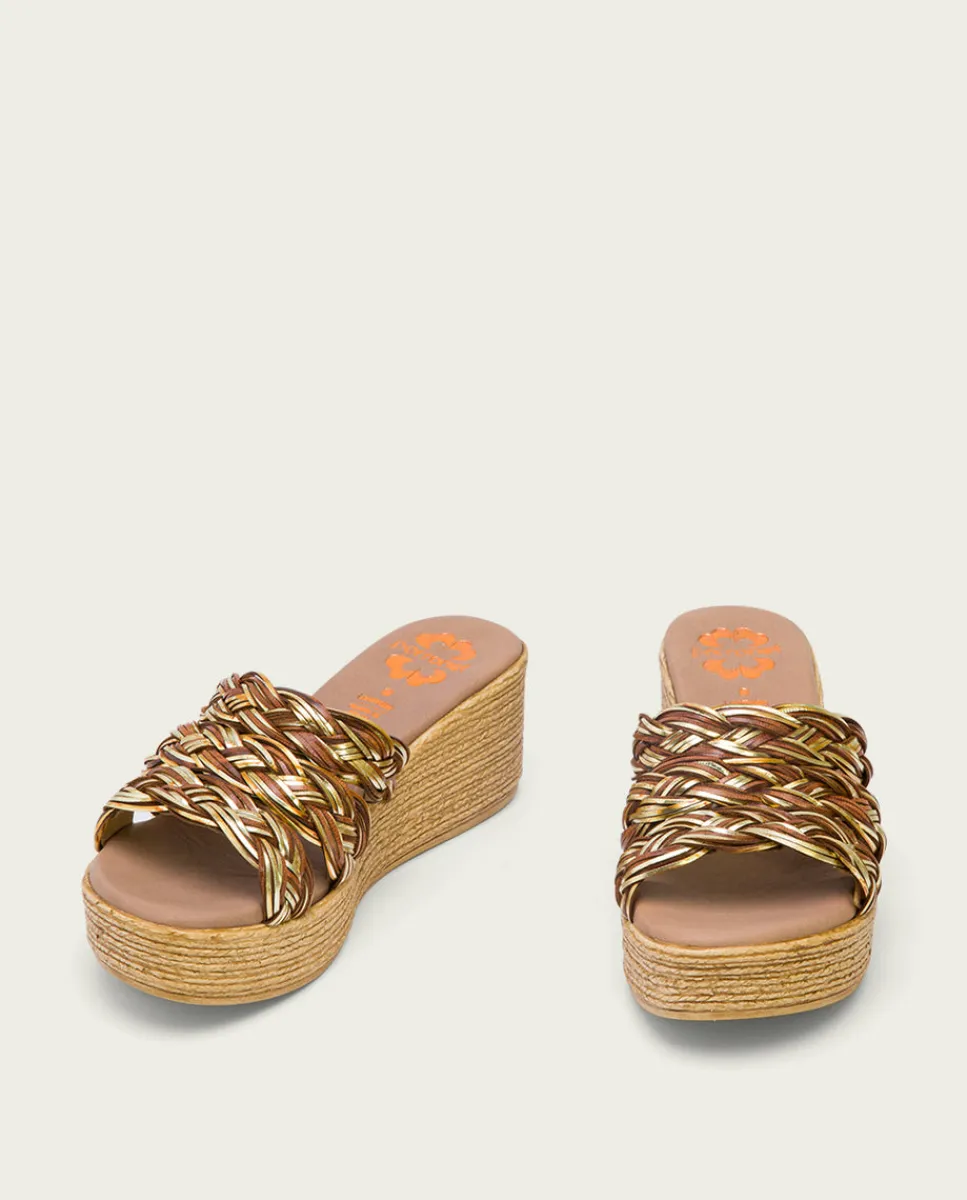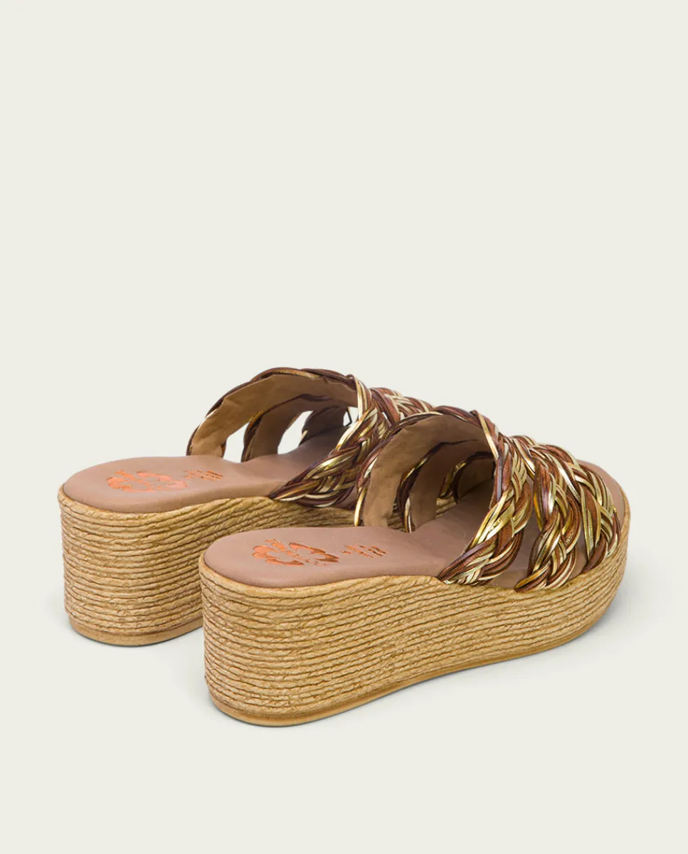Sandalia De Cuña Con Corte Trenzado Textil En Tonos Metalizados Y Forro De Microfibra Transpirable. Plantilla Acolchada De Piel Que Garantiza Una Gran Comodidad. Cuña De 6 Cm Y Plataforma De 3 Cm. Fabricado Artesanalmente En Espana.
