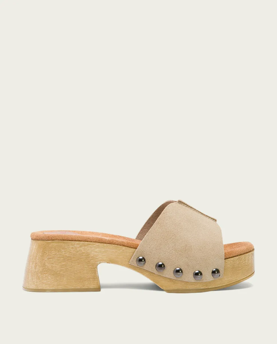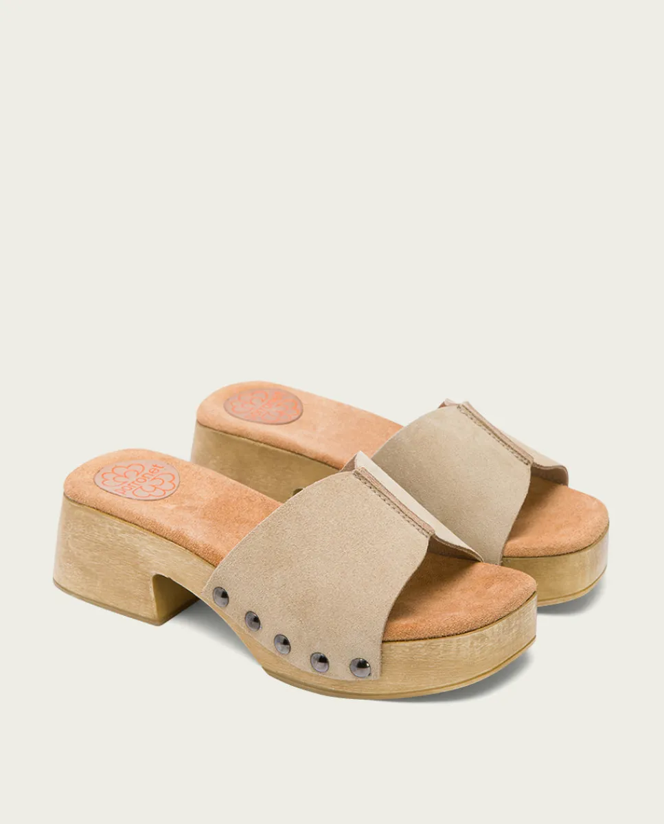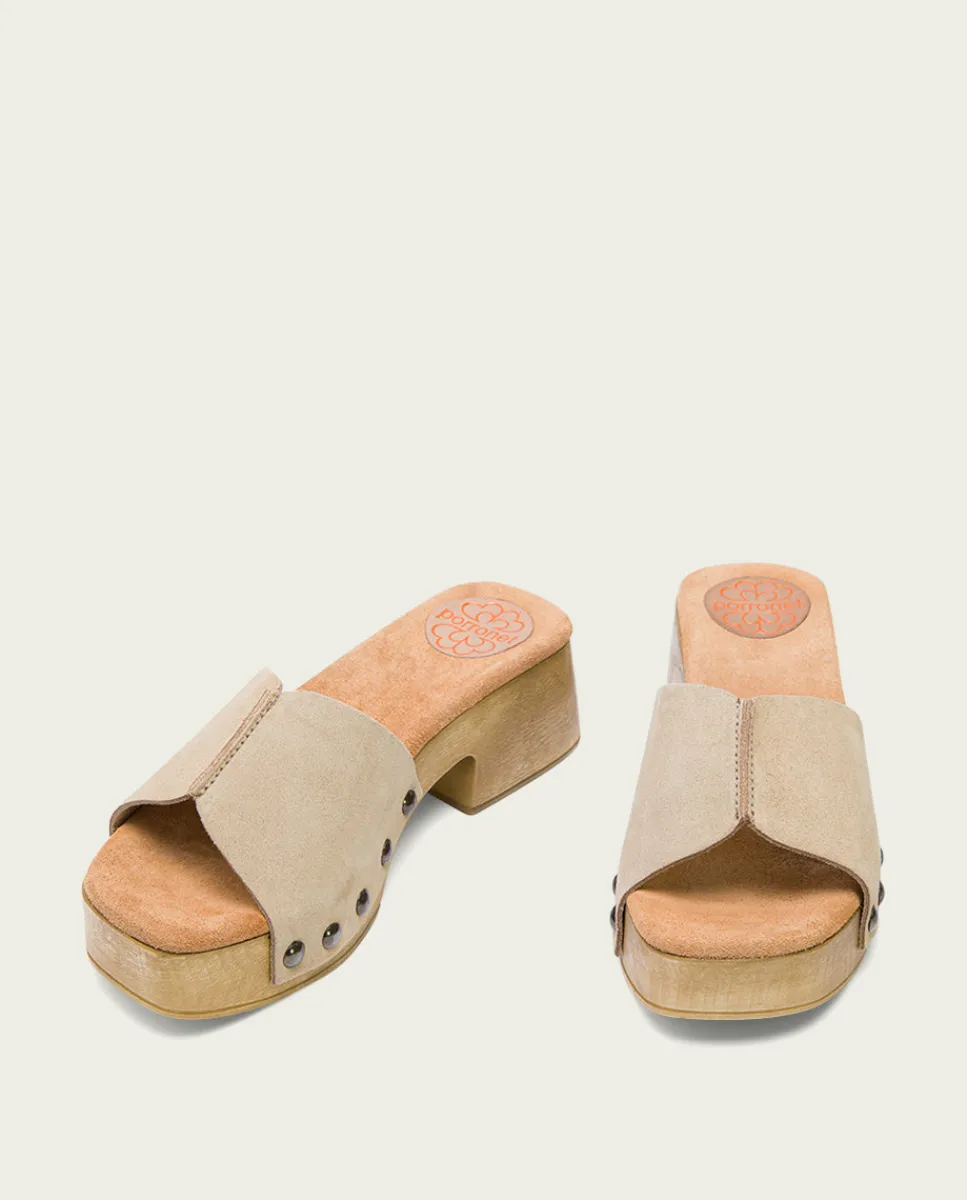 Sandalias De Tacón Bajo De Serraje Tipo Zueco Abierto. Piso De Tacón Ancho De 5 Cm Y Plataforma De 2,5 Cm Con Acabado De Madera. Plantilla Acolchada De Serraje Que Garantiza Una Gran Comodidad. Fabricado En Espana.